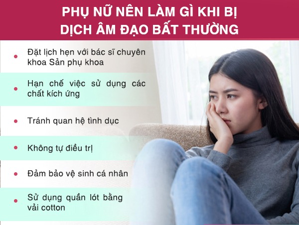 Khi phụ nữ bị dịch âm đạo bất thường, điều quan trọng là nên tham khảo ý kiến bác sĩ hoặc chuyên gia y tế để được đánh giá và chẩn đoán chính xác. Dưới đây là một số khuyến nghị chung mà phụ nữ có thể tuân thủ trong trường hợp bị khí hư bất thường: